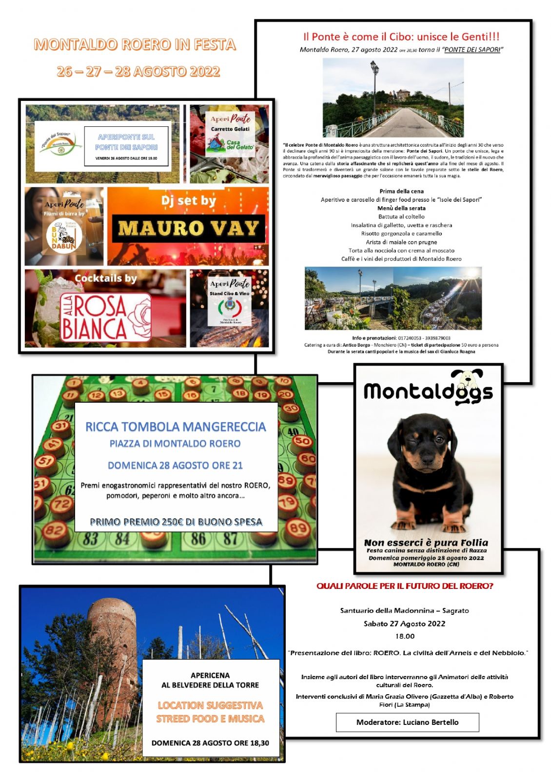 Si prosegue SABATO 27 agosto 2022 con la suggestiva Cena sul Ponte, affidata al Catering ANTICO BORGO di Monchiero, preceduta dalla presentazione di un libro sul Roero, con aperitivo e degustazione vini dei produttori locali.
