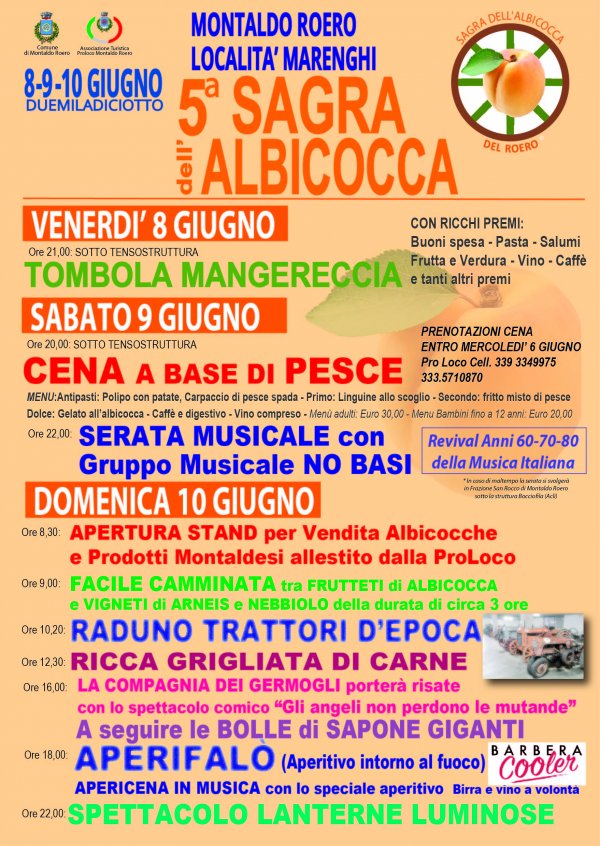 La sagra dell'Albicocca è un'occasione per immergersi nei colori e nei sapori del Roero. Giunta ormai alla sua quinta edizione, è proposta dalla Pro Loco di Montaldo Roero, in frazione Marenghi. Venerdì 8 giugno dalle ore 21 tombola magereccia con ricchi premi. Sabato 9 giugno alle 20.30 cena a base di pesce con un ricco menù. Chi volesse partecipare è pregato di prenotare entro mercoledì al numero 3335710870. Dopo la cena, alle ore 22, serata musicale con il gruppo NO BASI.
